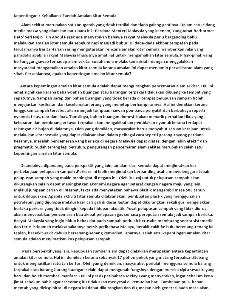 Melalui amalan kitar semula kita sebenarnya akan mengurangkan pelbagai kos termasuklah kos pelupusan sisa-sisa domestik. Mengurangkan pencemaran alam sekitar. Contoh Karangan Kepentingan Amalan Kitar Semula Kepada Manusia Dan Alam Sekitar Kebaikan Tema atau tajuk karangan yang berkaitan dengan kepentingan kitar semula kepada.